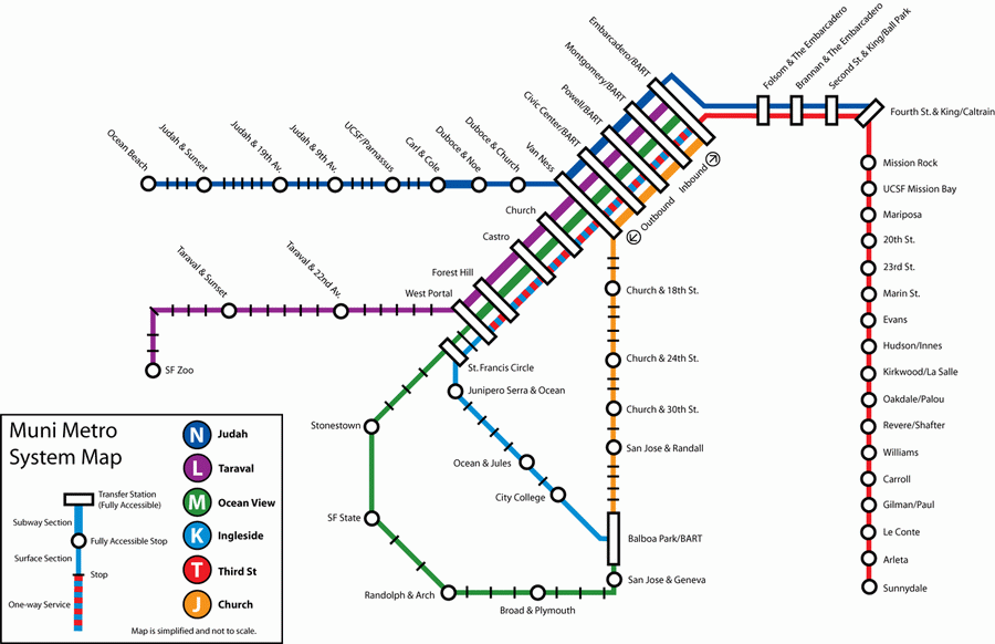 Схема маршрута Muni Metro. Центральный участок от Embarcadero до West Portal проходит в двухэтажном (BART нижний этаж) тоннеле под улицей Маркет.