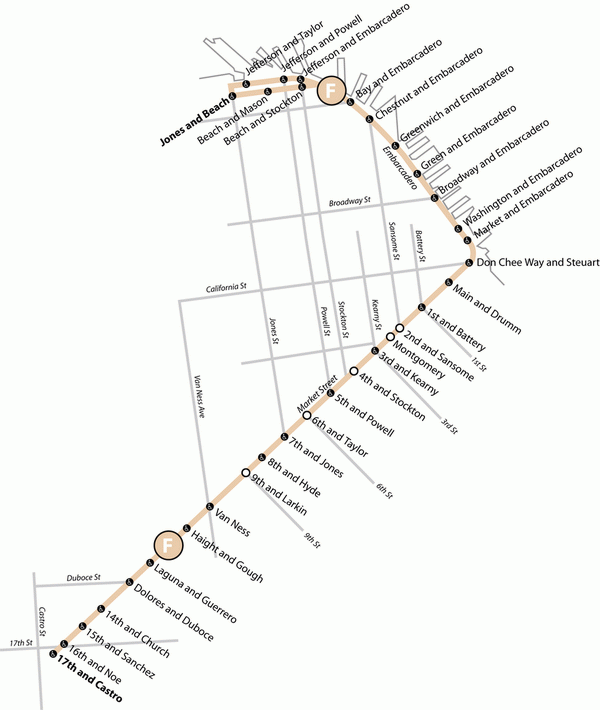Линия F Market & Wharves обычного трамвая проходит по деловому центру и множеству туристических точек Сан-Франциско, по улице Маркет и набережной Эмбаркадеро. На линии работает исключительно исторический подвижной состав, как из Сан-Франциско, так и других городов Америки, а также из других стран. Эксплуатация на линии исторического подвижного состава поддерживается благодаря работе энутзиастов, объединенных в общество Market Street Railway