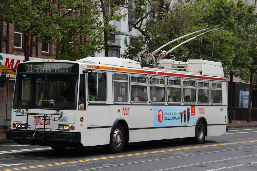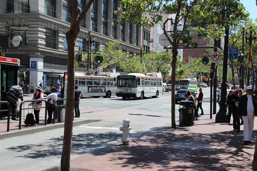 Пара фотографий троллейбуса Сан-Франциско на улице Маркет. Всего на 14 маршрутах эксплуатируется 240 Шкод и около 70 троллейбусов североамериканских производителей.