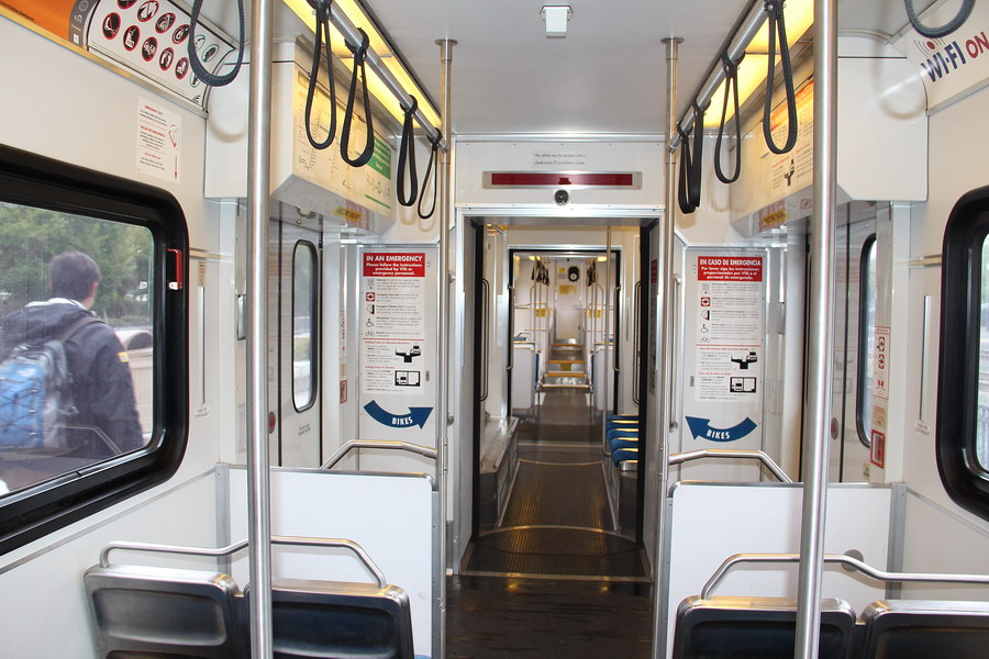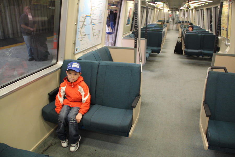 На втором этаже первого вагона. Не обратили, что этот вагон был "silent car", а поскольку у ребенка рот закрывается только во время сна, то нам было сделано замечание, что спать работягам мешаем. Вагон был полупустой, а вот в остальных народу было весьма значительно. Более того, в этот день куда-то из Сан-Хосе ехали группы школьников, но их сажали в последние вагоны, причем на станциях на табло и голосом объявляли, что в таких-то поездах поедут школьники и в последнем вагоне их будет 130, а в предпоследнем 90 (цифры условные), чтоб остальные пассажиры не боялись.