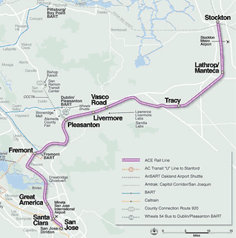 Позволю привести здесь выдержки из Вики: "Altamont Commuter Express (Алтамонский пригородный экспресс) — пригородный поезд, курсирующий в Калифорнии между Стоктоном и Сан-Хосе.