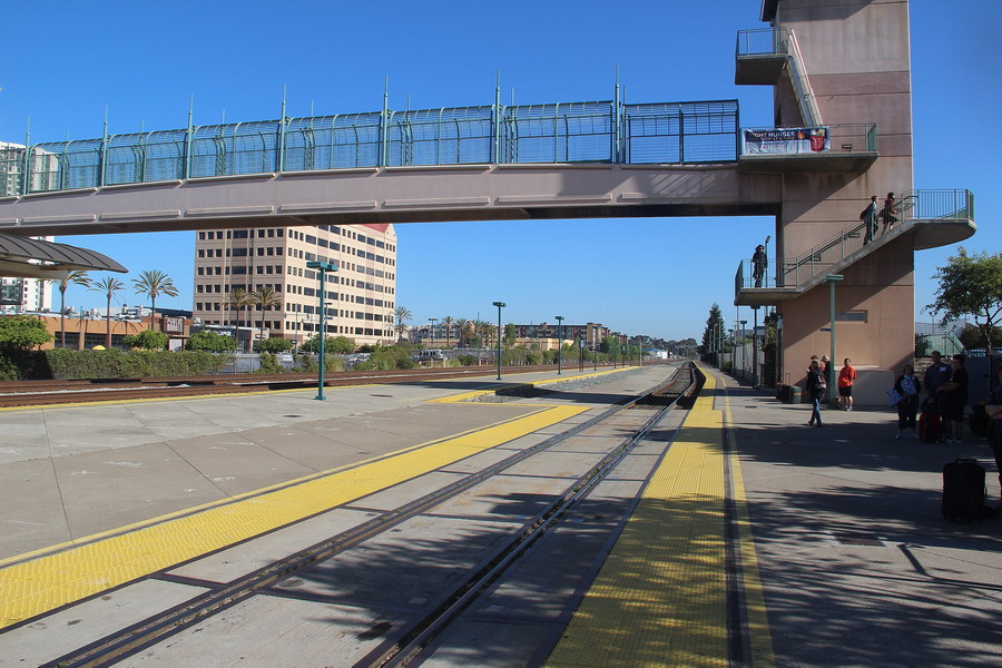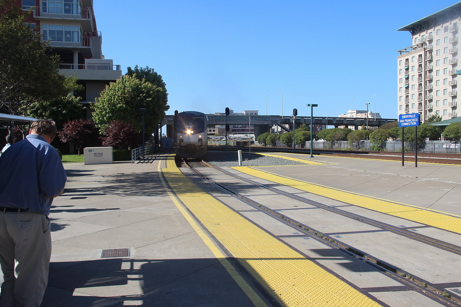 Помимо билетов на поезд мы приобрели также резервацию на автобус Амтрака от его терминала Ferry Building в Caн-Франциско. Автобус отправлялся в 07:50 утра, нам нужно было быть не позднее 07:20, а лучше чуть ранее, чтобы сдать багаж до Чикаго. Благо наше госотиница была в 10 минутах от терминала. Прибыли в Эмервиль, до поезда оставалось примерно 40 минут. Интересная особенность платформы в Эмервиле - первая платформа в средней своей части совершенно не возвышается над рельсами.