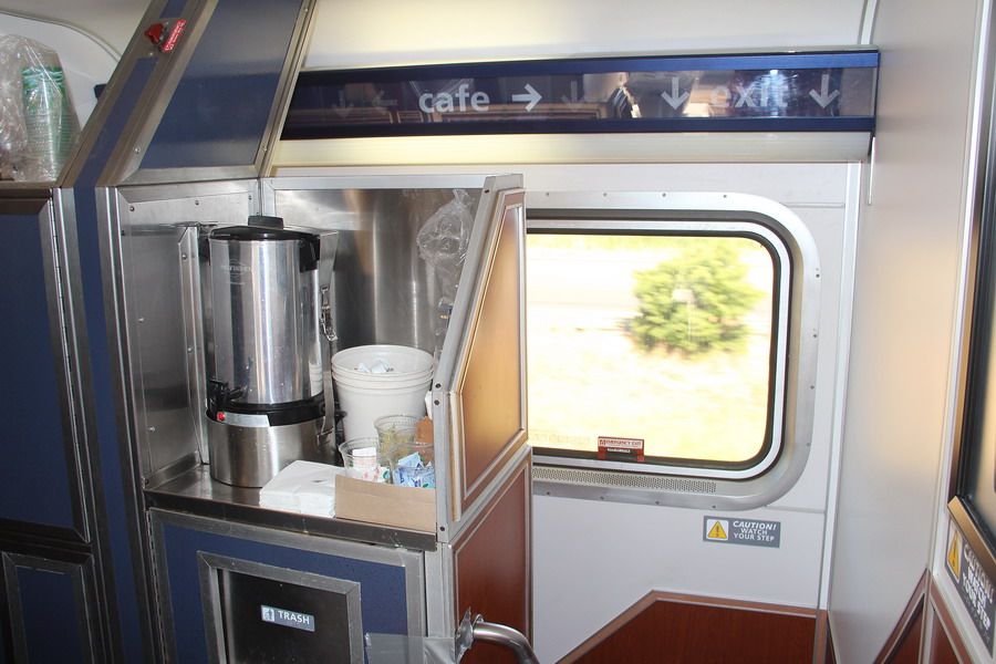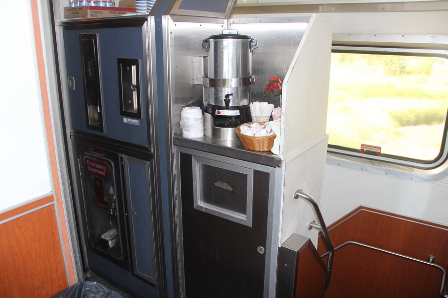 Средняя часть второго этажа вагона, лестница вниз и буфет с кофе, чаем и водой. Левее меня (не видно) буфет со льдом и соками. Все в неограниченном доступе.