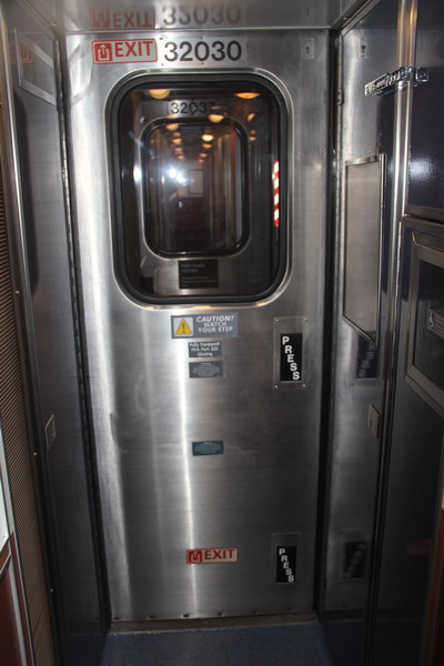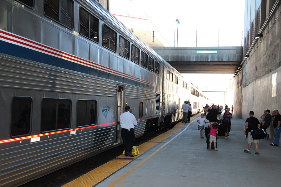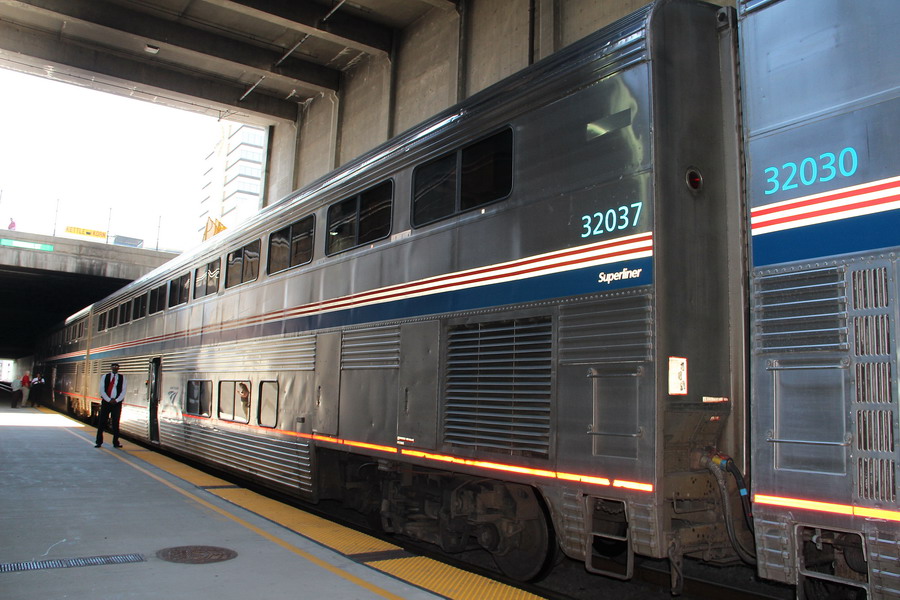 Подают наш поезд, его состав - два развернутых друг к другу кабинами тепловоза, херитажный багажный вагон, остальные вагоны типа Superliner, 4 вагона с местами для сидения, вагон-салон с буфетом, вагон-ресторан, три спальных вагона. Посадка в сидячие вагоны производилась в соответствии с пунктом назначения, кто до Солт-Лейк-Сити, кто до Денвера, кто дальше. Причем кому в какой садиться объявляли по трансляции и посадкой руководили проводники. Посадка в спальные вагоны, естественно, проводилась в соответствии с номером вагона и купе, указанным в билете.