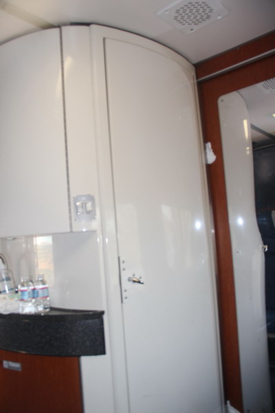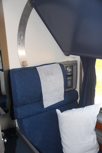 У нас было большое купе (Bedroom) с душем и туалетом на втором этаже среднего спального Superliner'а, то есть наш вагон был предпоследним. "Жилая часть" купе слева видны полочки с умывальником бокса душа и кресло в закутке за душевой кабиной.