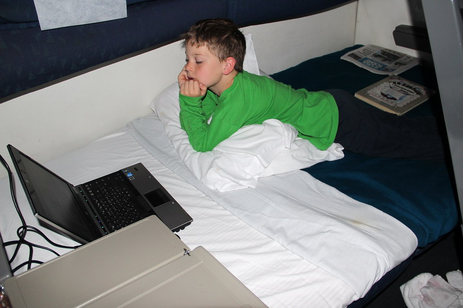 Семейное купе занимает всю ширину вагона, туалеты и душ общие на первом этаже, вид от двери купе во "взрослую" часть купе.