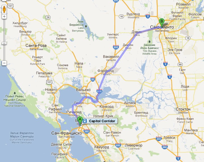 Первая часть маршрута от Эмервиля до Сакраменто сначала идет вдоль залива Сан-Пабло, где множество промышленных объектов, потом по мосту Бенишиа-Мартинес пересекает пролив Карквинес и вдоль берега залива Гризли углубляется вглубь суши в сторону Сакраменто.