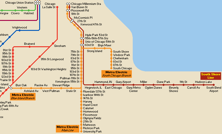 Проехали только один раз от станции "55-56-57 улицы" до конечной Чикаго Миллениум. Станция "55th-56th-57th Street". Также эта станция и пути до Кенсингтона используются одним из последних интерурбанов США "South Shore Line".