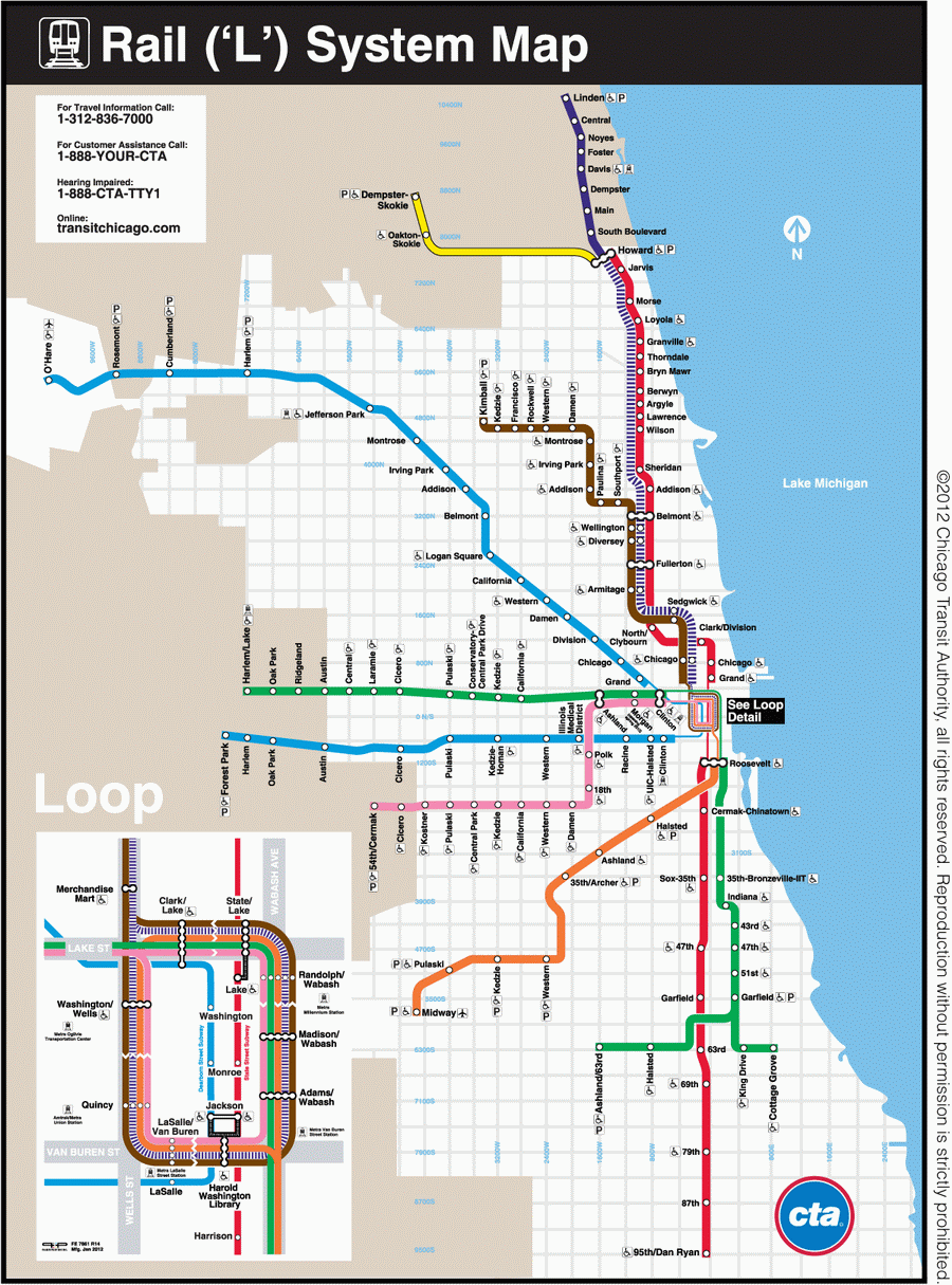 Красная и синяя линии проходят центр города в тоннелях, остальные линии (кроме желтой) следуют по кольцу (Loop), имея его конечной, то есть проходя кольцо либо по, либо против часовой стрелки (одностороннее движение) и возвращаясь на свою линию, зеленая линия идет транзитом по кольцу двусторонним движением по его северной и восточной частям.