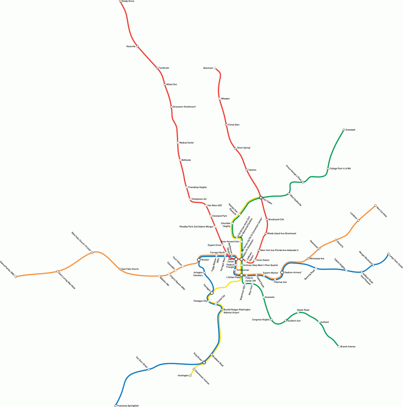 Вашинтонский метрополитен (именно "Метро" по названию), сеть из пяти линий протяженностью примерно 170 км. Метрополитен не городской, а межштатовский обслуживает округ Колумбия (прямоугольник на схеме), а также штаты Виргиния и Мериленд, "Большой Вашингтон". На схеме система выглядит компактной....