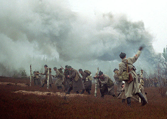 Soviets surmounts the first line of wire obstacles.